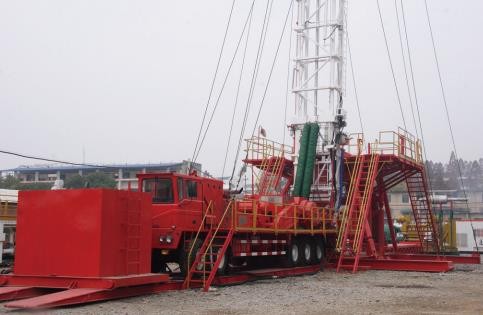 ◆ 柴油機分動箱、絞車和井架放置在自走式底盤車上,用雙節伸縮式井架,用液缸起升,井架繃繩用地錨固定,配底座或者小修平臺,能夠實現修井機快速移運。